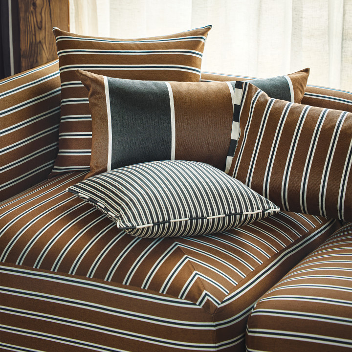 Arbury redefines the block stripe with its commanding scale and eye-catching colours, infusing a timeless design with fresh energy. Woven from a cotton blend with a touch of linen, the twill weave exudes subtle character and a gentle movement of colour.