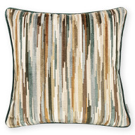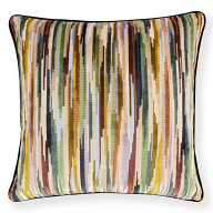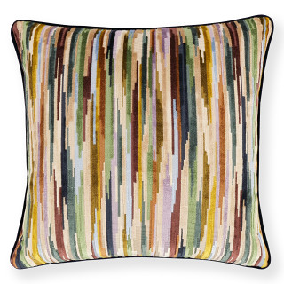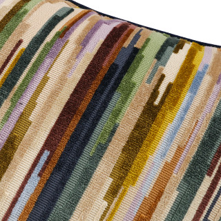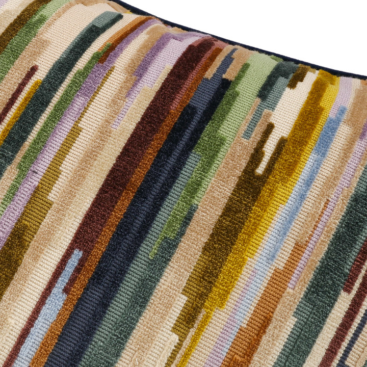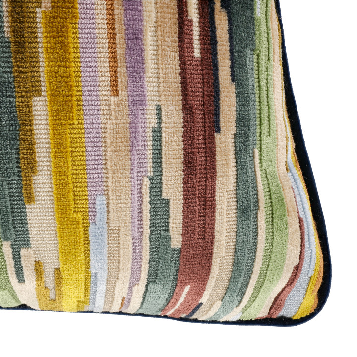 Coloridas rayas interrumpidas de terciopelo cortado y sin cortar crean un cojín con un fascinante dibujo escalonado repleto de detalles y texturas.