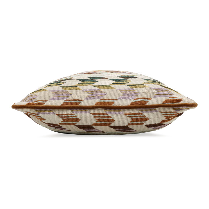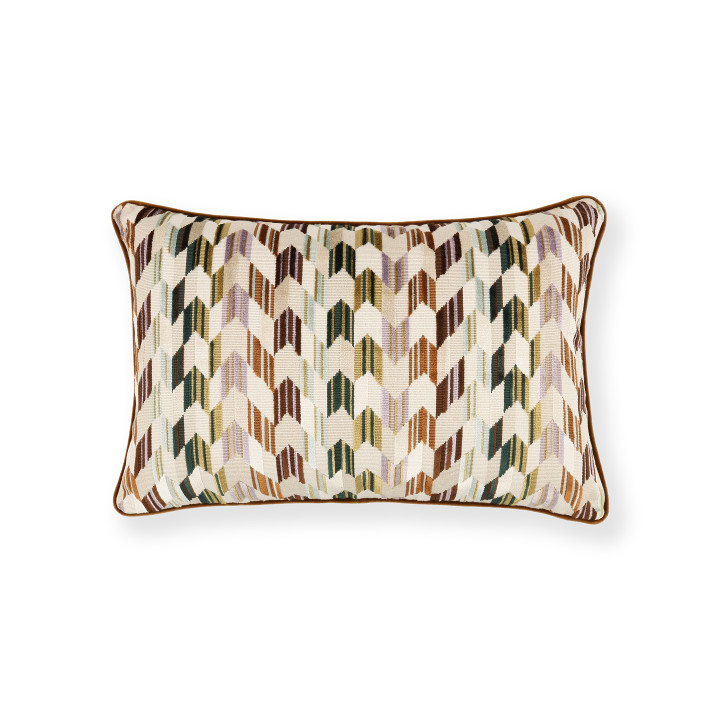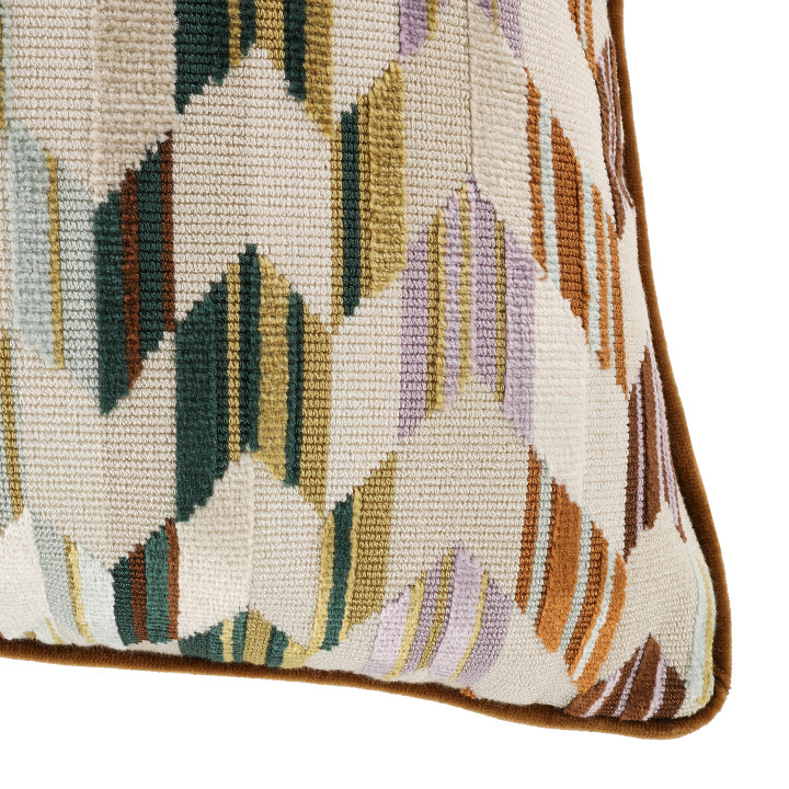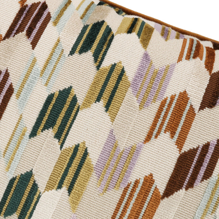 Expansivo motivo geométrico que ofrece una abundancia de textura, estilo, dibujo y color. La disposición rítmica del dibujo, que evoca puntas de flecha, sube y baja sobre un decadente pelo de rizo en el que se han recortado ciertas zonas para aportar una dimensión extra y esa textura aterciopelada que tan importante resulta.