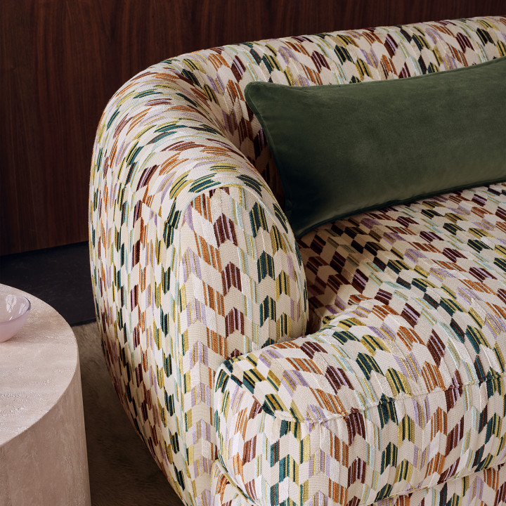 Expansivo motivo geométrico que ofrece una abundancia de textura, estilo, dibujo y color. La disposición rítmica del dibujo, que evoca puntas de flecha, sube y baja sobre un decadente pelo de rizo en el que se han recortado ciertas zonas para aportar una dimensión extra y esa textura aterciopelada que tan importante resulta. Una mezcla moderna de futuristas combinaciones de colores que cambian y alternan por toda la superficie, creando un sentido de superposición y movimiento que le da mucho garbo a este tejido ignífugo para tapicerías.