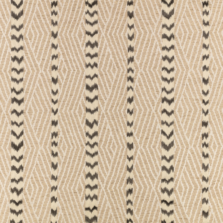 Un jacquard organique à losanges est recouvert d'une bande brodée audacieuse, réalisée à partir d'un mélange de points de croix texturés et de points satinés brillants, créant un effet inspiré de l'ikat. Le jeu entre brillance et douceur crée une dimension élégante, donnant naissance à un tissu polyvalent à la fois contemporain et intemporel.