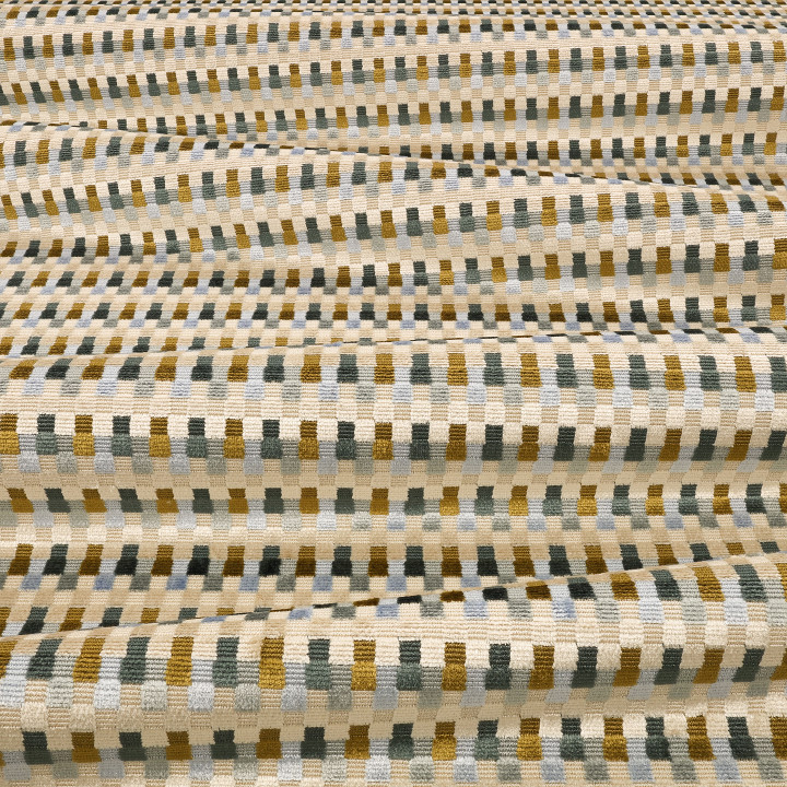 Des carrés alternés de velours bouclé coupé et non coupé créent un design sculpté à petite échelle, riche en texture et en couleur. Les variations dans la hauteur des poils rehaussent le motif géométrique, donnant au design un aspect dimensionnel.