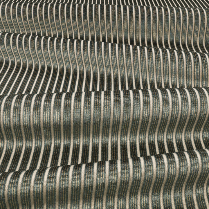 Une rayure intemporelle en velours, bordée d'un fin velours bouclé, merveilleusement douce au toucher et qui se détache fièrement sur un fond jacquard raffiné. Chaque rayure aux couleurs riches présente des lignes complexes qui se complètent harmonieusement.