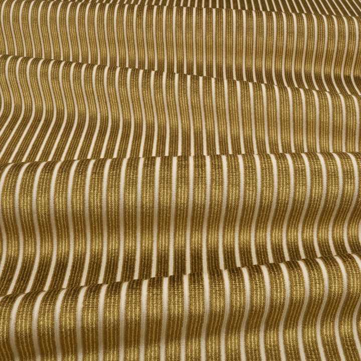 Une rayure intemporelle en velours, bordée d'un fin velours bouclé, merveilleusement douce au toucher et qui se détache fièrement sur un fond jacquard raffiné. Chaque rayure aux couleurs riches présente des lignes complexes qui se complètent harmonieusement.