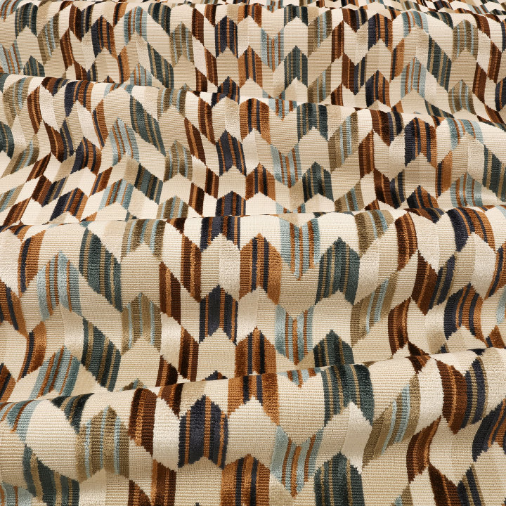 Un motif géométrique complet qui offre texture, style, design et couleurs à profusion. Le motif rythmé aux formes de flèches monte et descend sur un velours bouclé somptueux où des parties du design ont été découpées pour ajouter de la dimension et une texture veloutée essentielle. Un mélange moderne de combinaisons de couleurs avant-gardistes qui évolue et alterne habilement sur toute la surface, et crée une impression de superposition et de mouvement, conférant ainsi une touche innovante et contemporaine à ce tissu d'ameublement ignifugé.